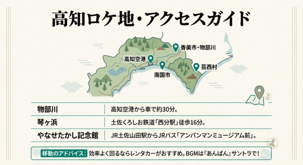 ご紹介した高知県内の主要ロケ地や観光スポットを、分かりやすく一覧表にまとめました。高知県は東西に広く、スポット間の移動には意外と時間がかかることもあります。この表を参考に、無理のない旅行計画を立ててくださいね。