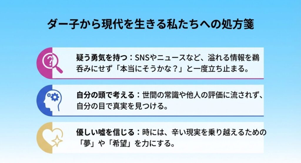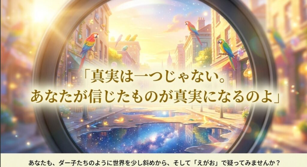 テレビのニュース、SNSのタイムライン、世間の常識、他人の評価。そういった「目に見えるもの」に振り回されず、一度立ち止まって「本当にそうかな?」と疑ってみる。自分の頭で考え、自分の目で真実を見つけること。そして時には、辛すぎる現実を乗り越えるために、楽しくて優しい「嘘(夢や希望)」を信じてみること。