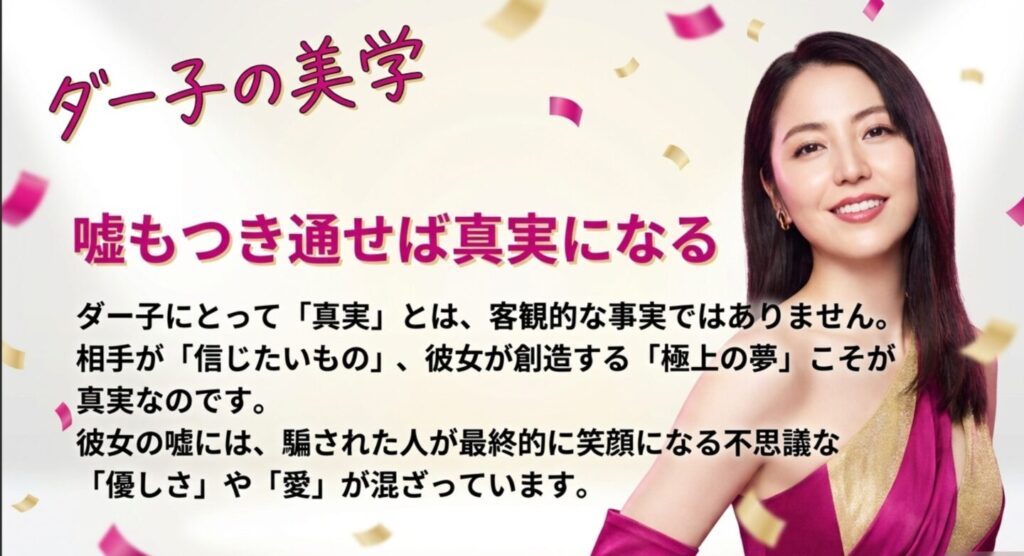 主人公のダー子自身も、数々の名言を残しています。彼女にとって「真実」とは、客観的な事実(Fact)のことではありません。「相手が信じたいもの」こそが真実であり、それは彼女自身が創造できるものなんです。