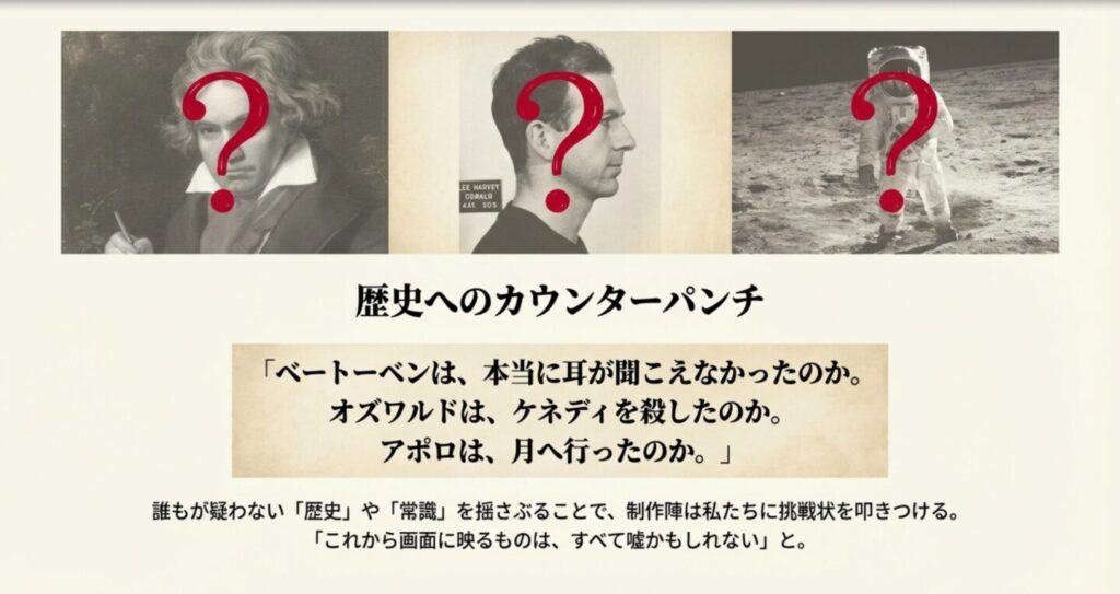 このセリフの面白いところは、誰もが疑いもしない「歴史的事実」や「常識」を例に挙げている点です。ベートーベンやアポロ計画といった教科書レベルの事実でさえ、「もしかしたら誰かが作った壮大な嘘かもしれない」という可能性を提示することで、視聴者の足元を揺さぶります。