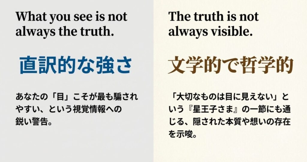 もう一つの解釈として、「真実はいつも目に見えるわけではない」という表現も可能です。こちらは、サン=テグジュペリの『星の王子さま』にある有名な一節「大切なものは目に見えない(What is essential is invisible to the eye)」に通じる、どこか温かく哲学的な響きを持っています。