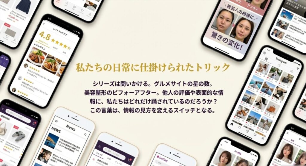 また、第2話以降も「グルメサイトの星の数」や「美容整形のビフォーアフター」など、より現代的なテーマを扱いながら、私たちが普段いかに「他人の評価」や「表面的な情報」に踊らされているかを皮肉っています。このナレーションを聞くだけで、情報の見方が少し変わる気がしませんか?