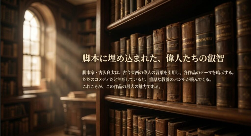 また、「英雄編」でのブレヒトの引用「英雄のいない時代は不幸だが、英雄を必要とする時代はもっと不幸だ」も強烈です。これは、私たちが無意識に求めてしまう「正義の味方」への依存心を鋭く批判しています。ただのコメディだと思って油断していると、こうした重厚な教養パンチが飛んでくるのが、この作品の油断できないところであり、最大の魅力でもあります。