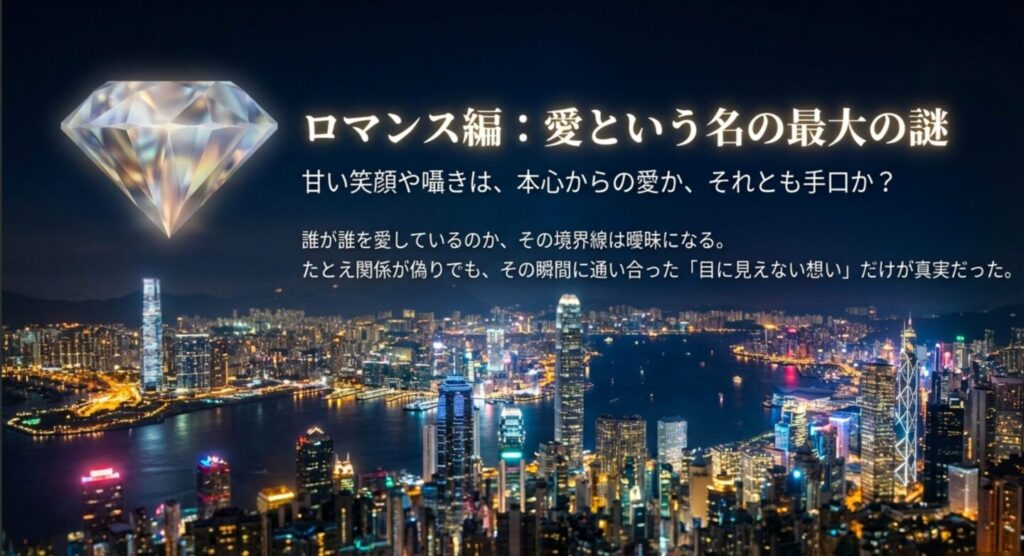 たとえ二人の関係が偽りであったとしても、その瞬間に通い合った視線やぬくもりだけは「真実」だった。ロマンス編は、「目に見える関係性」よりも「目に見えない想い」の尊さを描いた傑作だと思います。