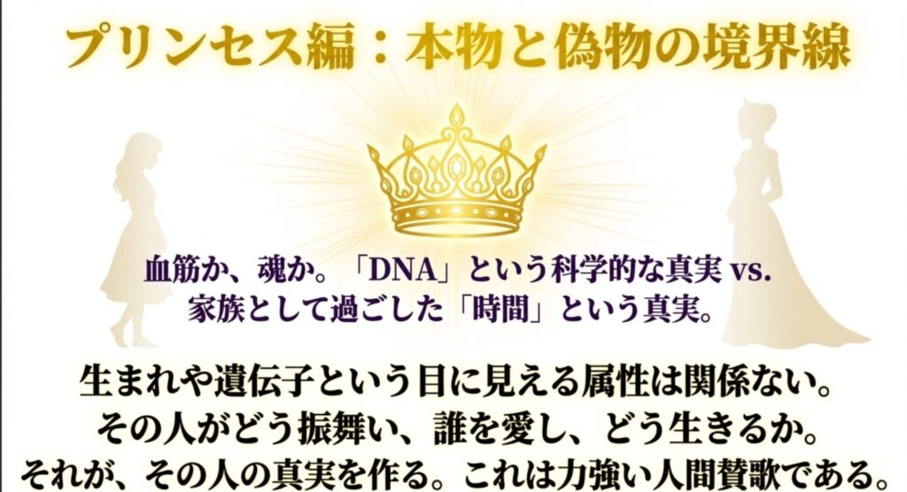 周囲からは「偽物だ」「詐欺師だ」と疑われ、DNA鑑定という科学的な証拠も突きつけられます。しかし、コックリはフウ家の当主としての教養を身につけ、家族としての時間を積み重ね、誰よりもフウ家の精神を受け継いでいきます。「偽物も本物も紙一重」「嘘も100回つけば本当になる」という言葉が出てきますが、最終的にコックリは、血の繋がった誰よりも気高く、優しい「本物のプリンセス」として覚醒します。