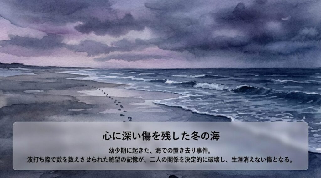 セリとジョンヨンの関係性を決定的に破壊し、二人の心に生涯消えることのない深い傷を負わせたのが、幼少期に起きた「海での置き去り事件」です。