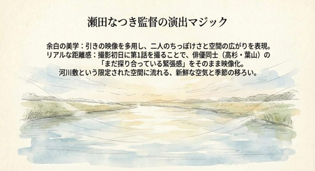 このドラマの最大の特徴は、「ほぼ河川敷だけで物語が進む」という点です。普通なら絵面が変わらず飽きてしまいそうな設定ですが、メイン監督を務めた瀬田なつきさんの手腕が光ります。瀬田監督は、映画『PARKS パークス』などで見せた瑞々しい映像感覚を、この限定された空間にも持ち込んでいます。